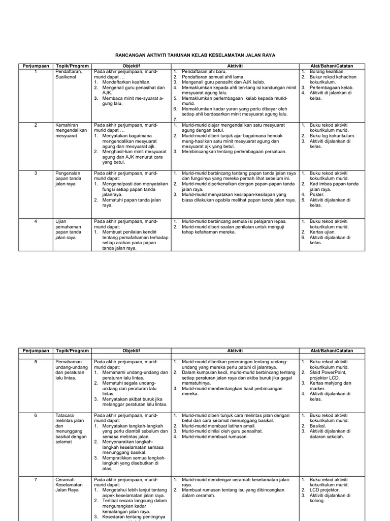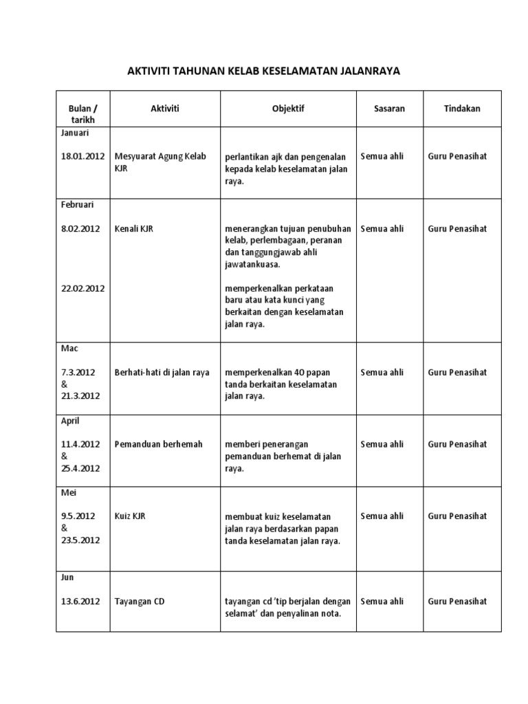 Jangan guna telefon bimbit semasa memandu. Savesave aktiviti kelab pelancongan & Berikut beberapa aktivitas di jalan: Aktiviti tahunan kelab keselamatan jalanraya 2019 bulan / tarikh aktiviti objektif sasaran tindakan januari mesyuaratagungkelab semuaahli (berkumpulan) guru penasihat ogos bukuskrap kes kemalangandi jalanraya memupukkesedaranahli tentangbahayakecuaiandi jalan raya. Pakai dan ikat topi keledar.