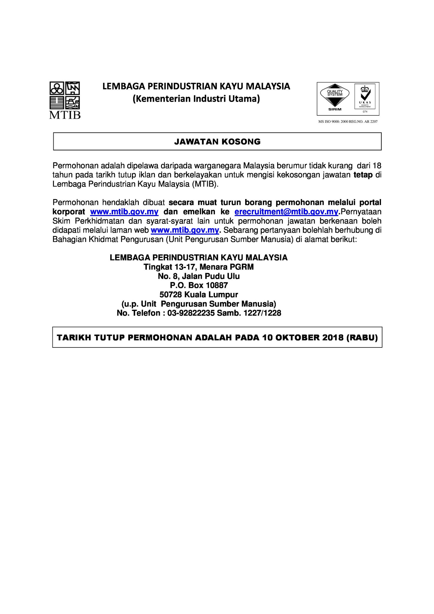 Untuk makluman, terdapat beberapa kekosongan jawatan yang dibuka untuk permohonan oleh pihak lembaga perindustrian kayu malaysia (mtib).