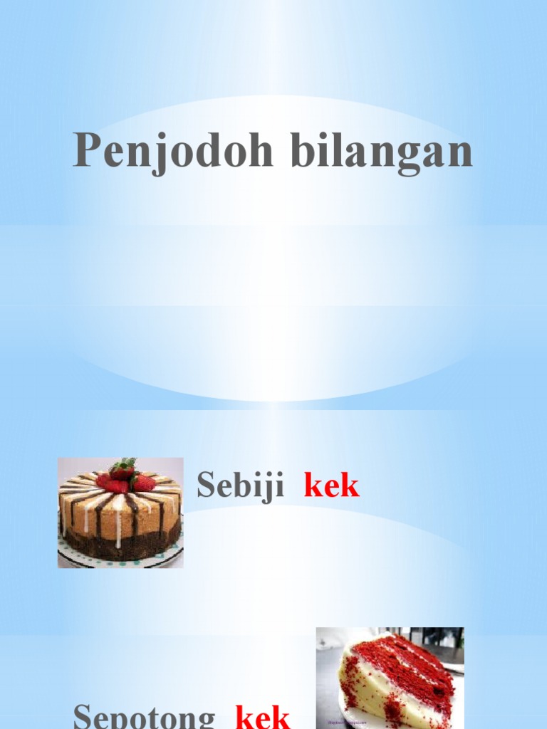 Penjodoh Bilangan Untuk Kek - Kadangkala kata bilangan disertai penjodoh bilangan seperti batang, buah, ekor, orang, dan sebagainya.
