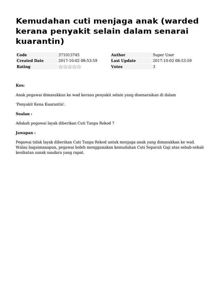 Surat permohonan cuti bisa diajukan jika syarat untuk mendapatkan cuti sudah terpenuhi tentunya. Kemudahan cuti kuarantin ini diperluas kepada pegawai yang anaknya menghidap penyakit berjangkit dan perlu dikuarantin. Berapakahtempoh kelayakan kemudahan cuti kuarantin?(i) tempoh yang boleh diluluskan adalah terhad kepada maksimum lima (5) hari bagi setiap kes walaupun tempoh perakuan tersebut adalah. Muat turun untuk kegunaan guru dan ibu bapa. Kemudahan cuti kuarantin telah diperuntukkan di bawah perintah am 24 bab c (cuti) kepada pegawai yang 9.