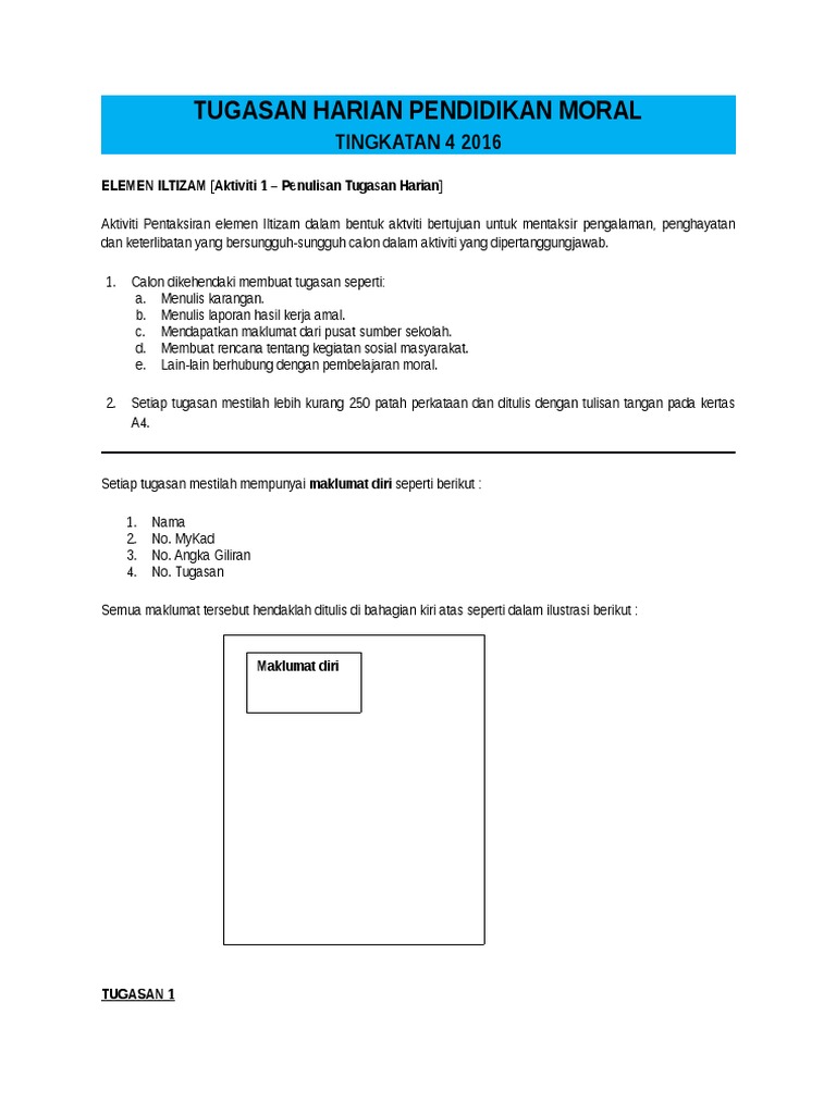 Related : Tugasan Harian Moral Tingkatan 4 Patriotisme : Pendidikan moral-tugasan-harian / Perhatian kepada pelajar tingkatan 4 yang mengambil mata pelajaran pendidikan islam..